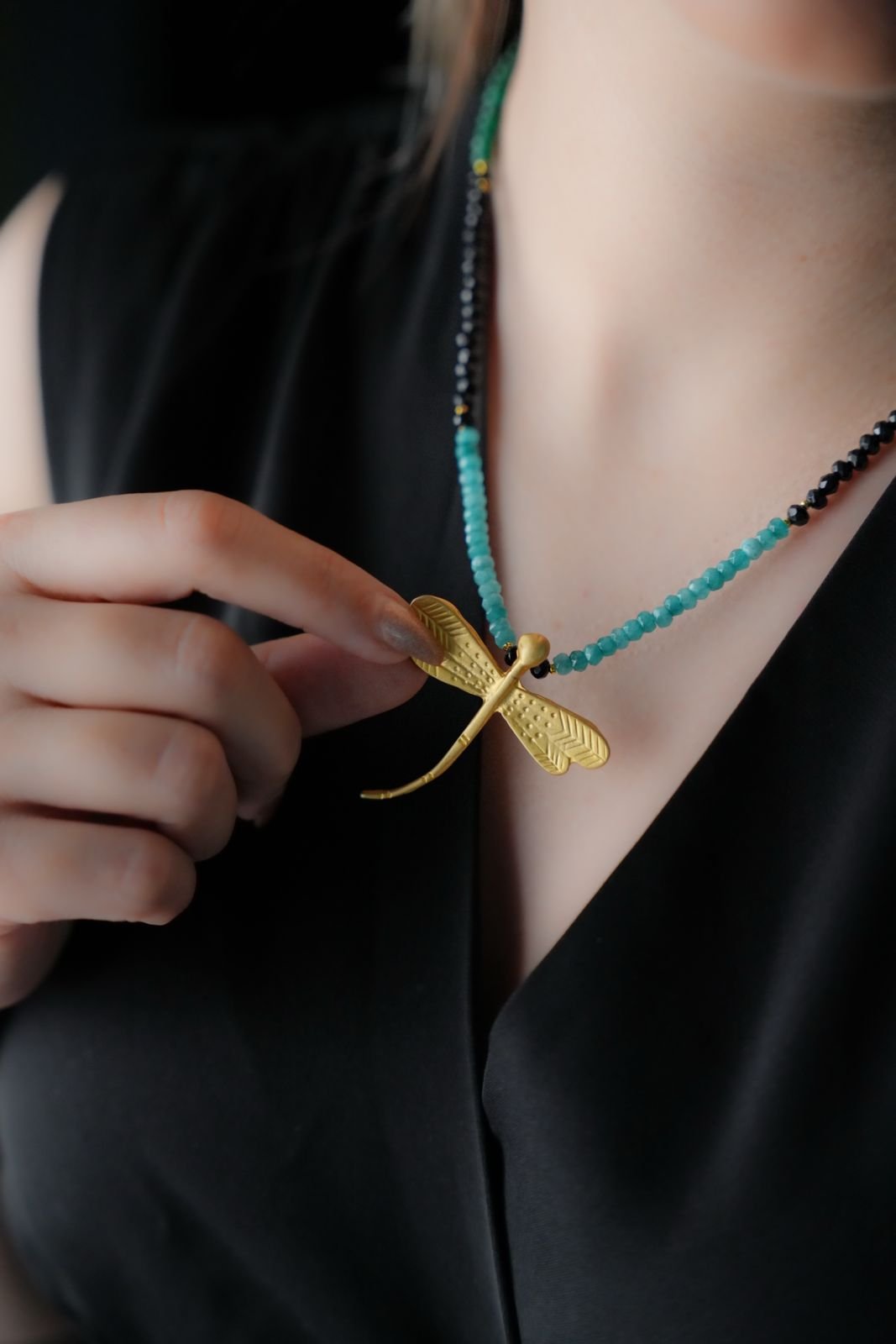 18k gold-plated necklace in the shape of a dragonfly,adorned with colorful stones.Handcrafted, a one-of-a-kind piece with delicate, refined charm.