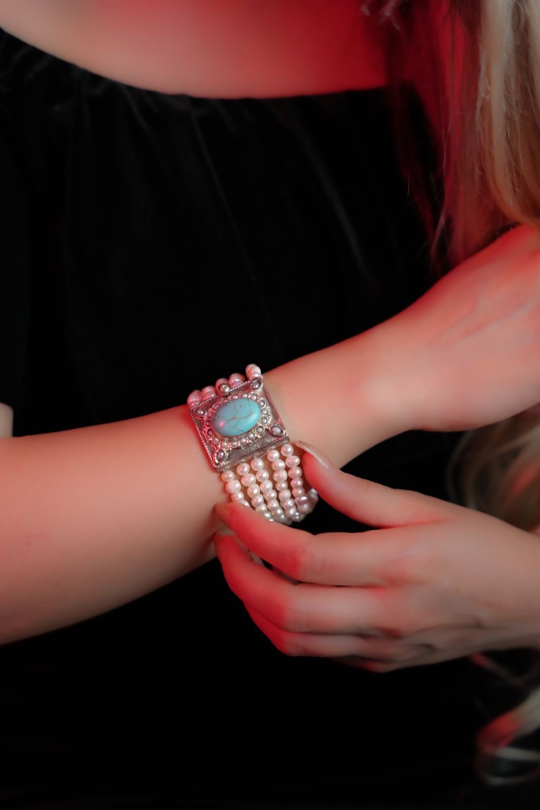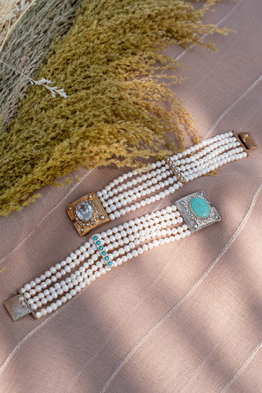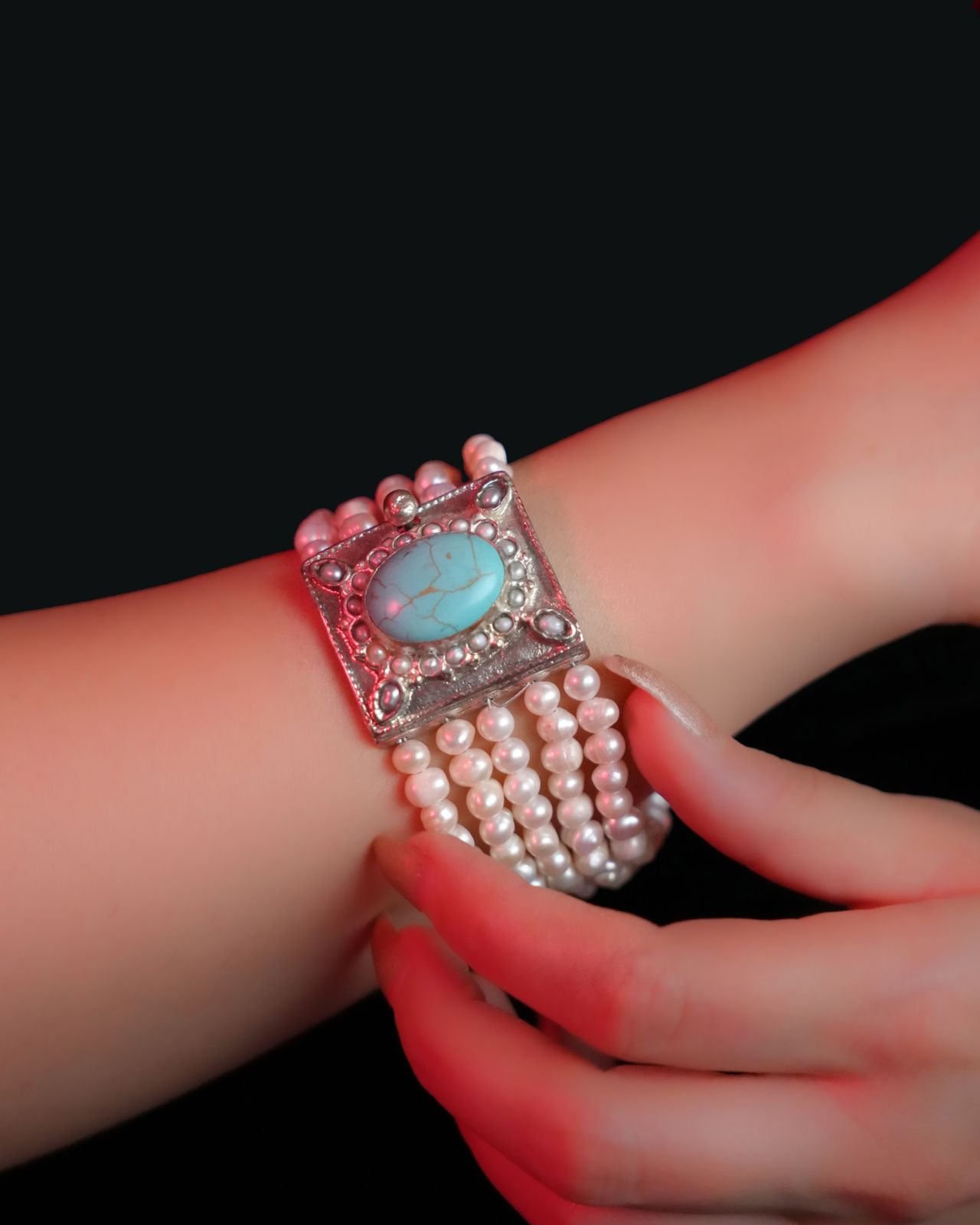 Gold-plated bracelet hand-made adorned with delicate perls and natural turquoise stone