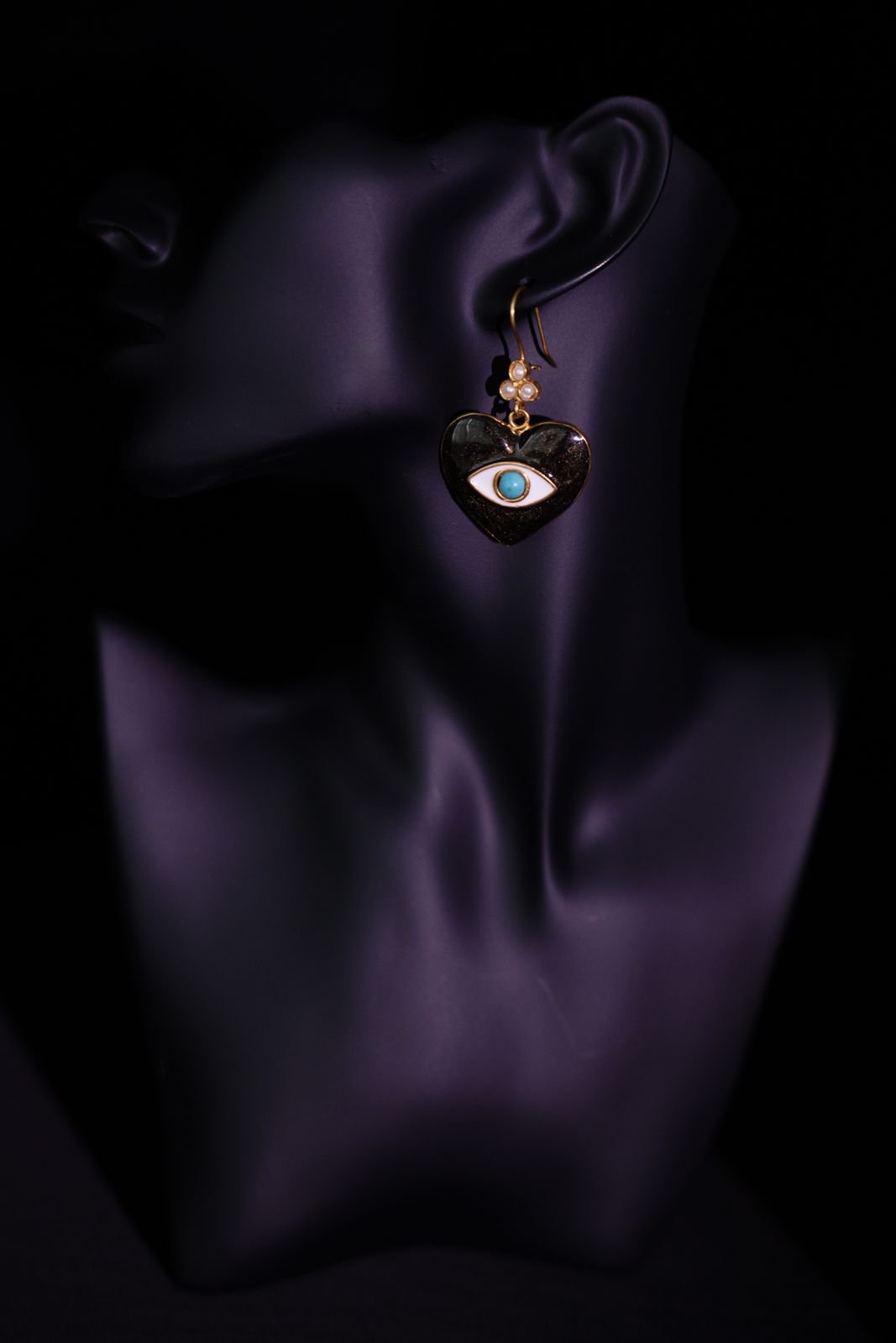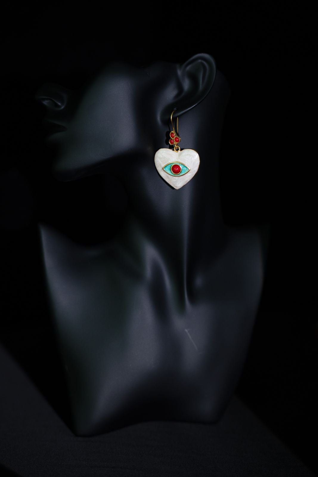 Heart-shaped earring in bronze and silver,hand-painted and adorned with semi-precious stones.one-of-a-kind piece.
