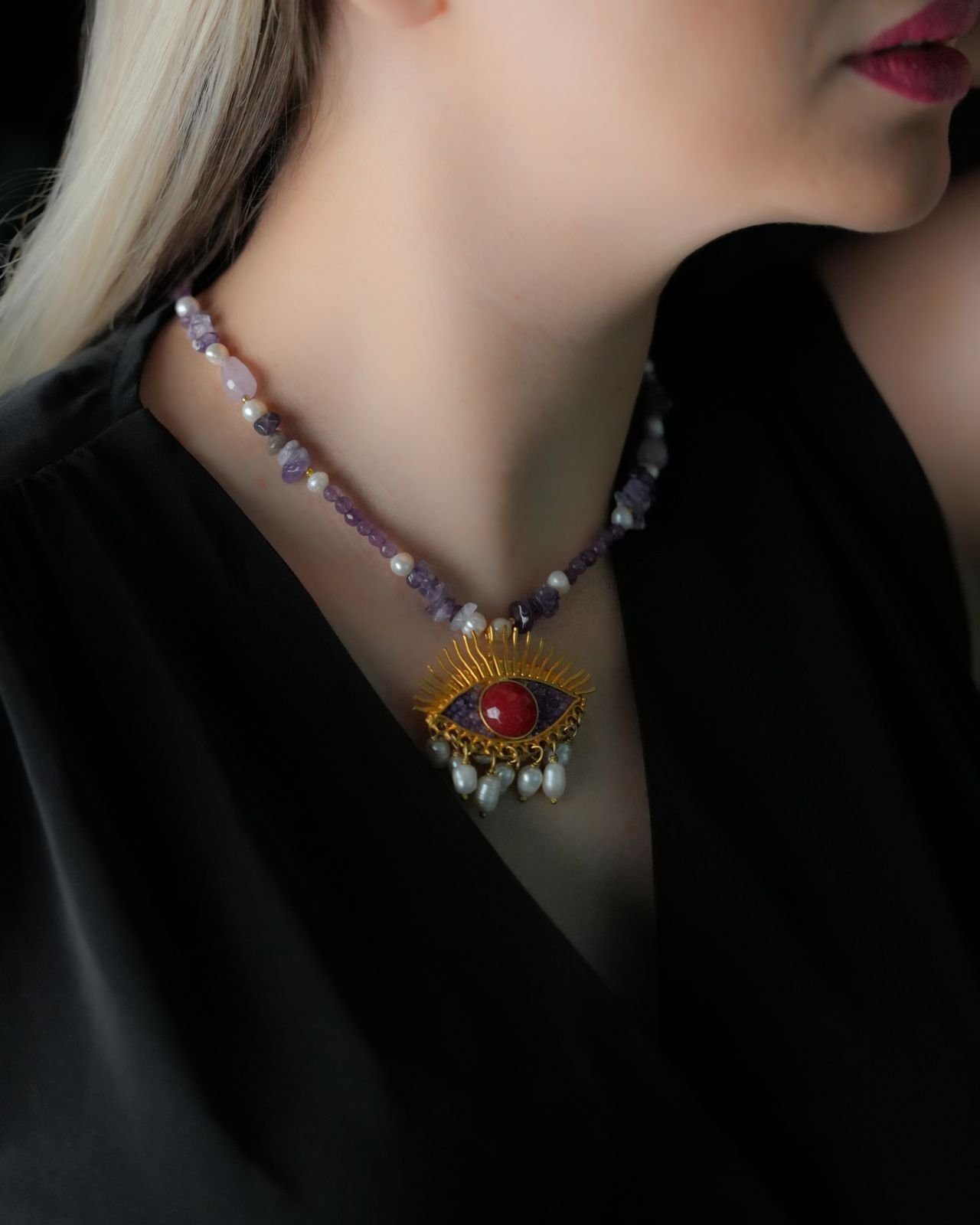 Hand crafted bronze necklace adorned with a rich variety of natural stones,blending authenticity with timeless elegance