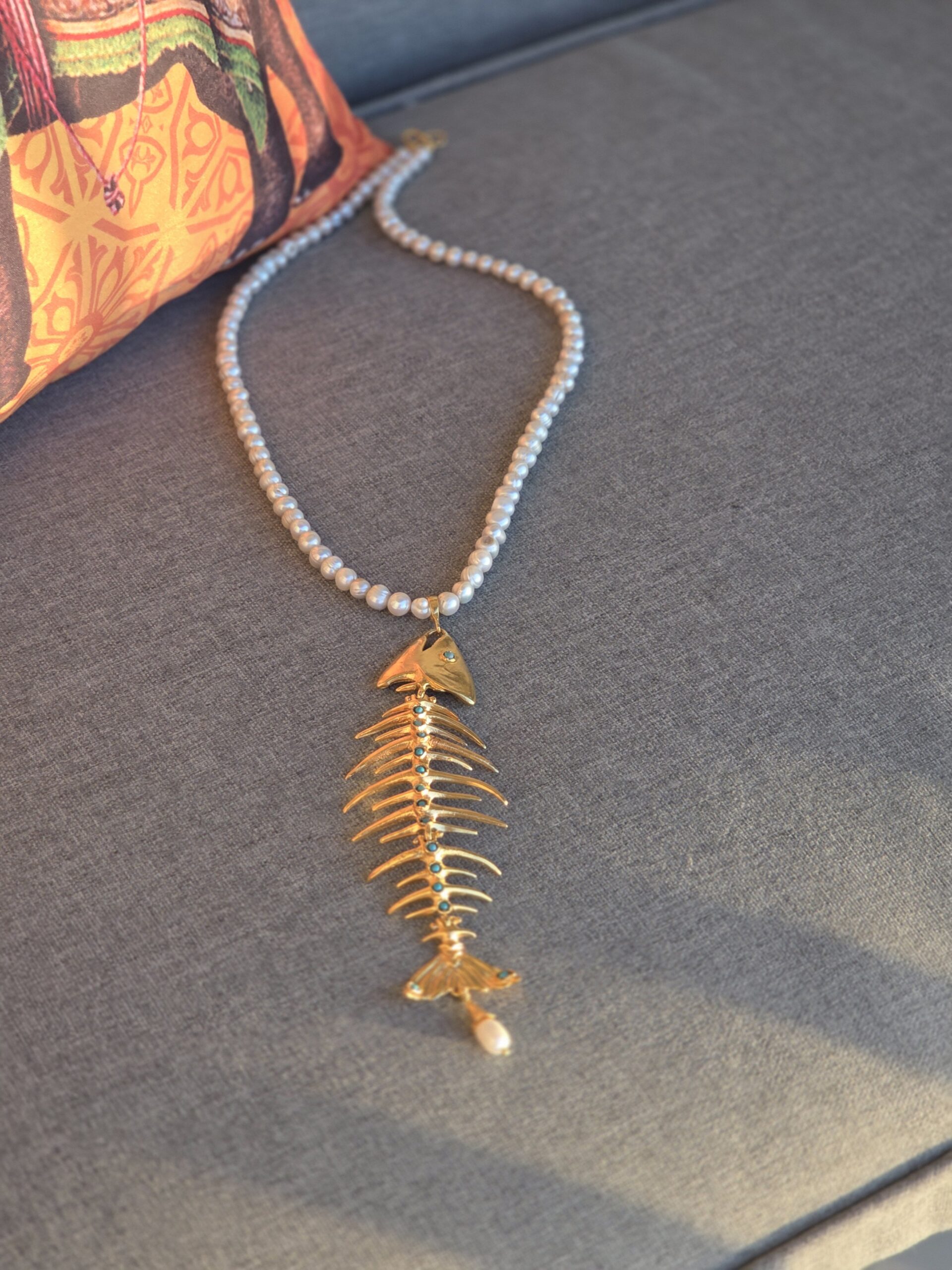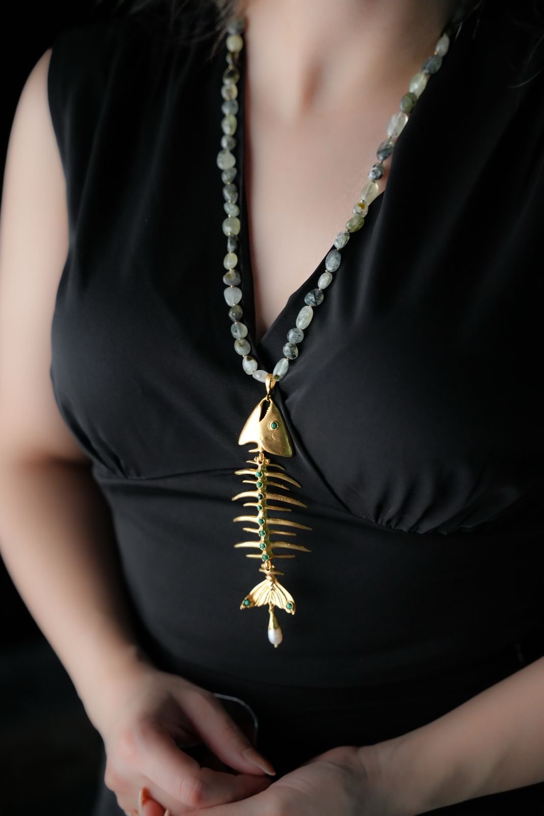 22k gold-plated necklace in shape of a fish, adorned with malachite. AÂ handmade,original,and one-of-a kind cration.
