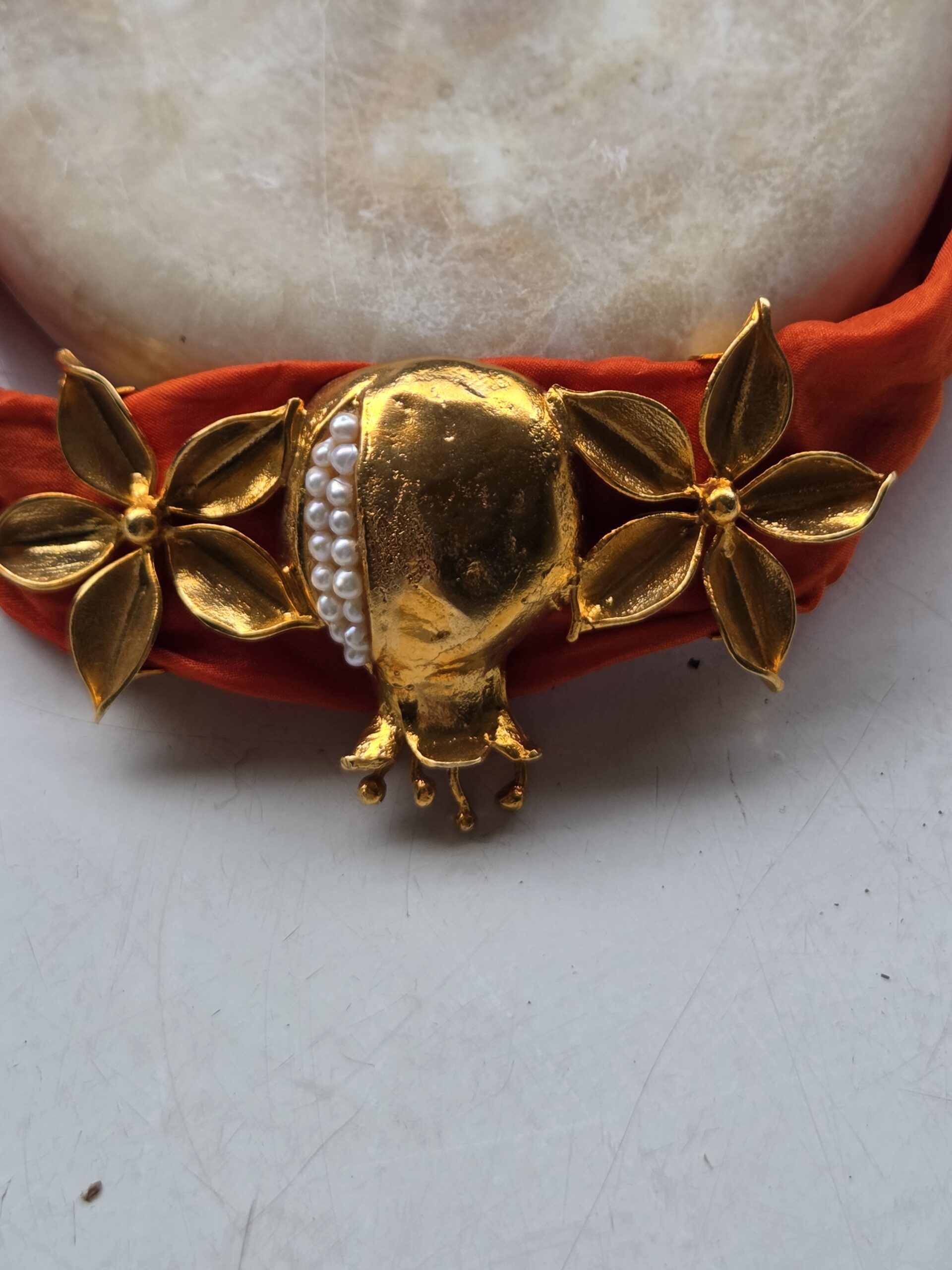 Hand made luxury choker necklace in 22-carat gold plate, silk, and a radiant semi-precious stone